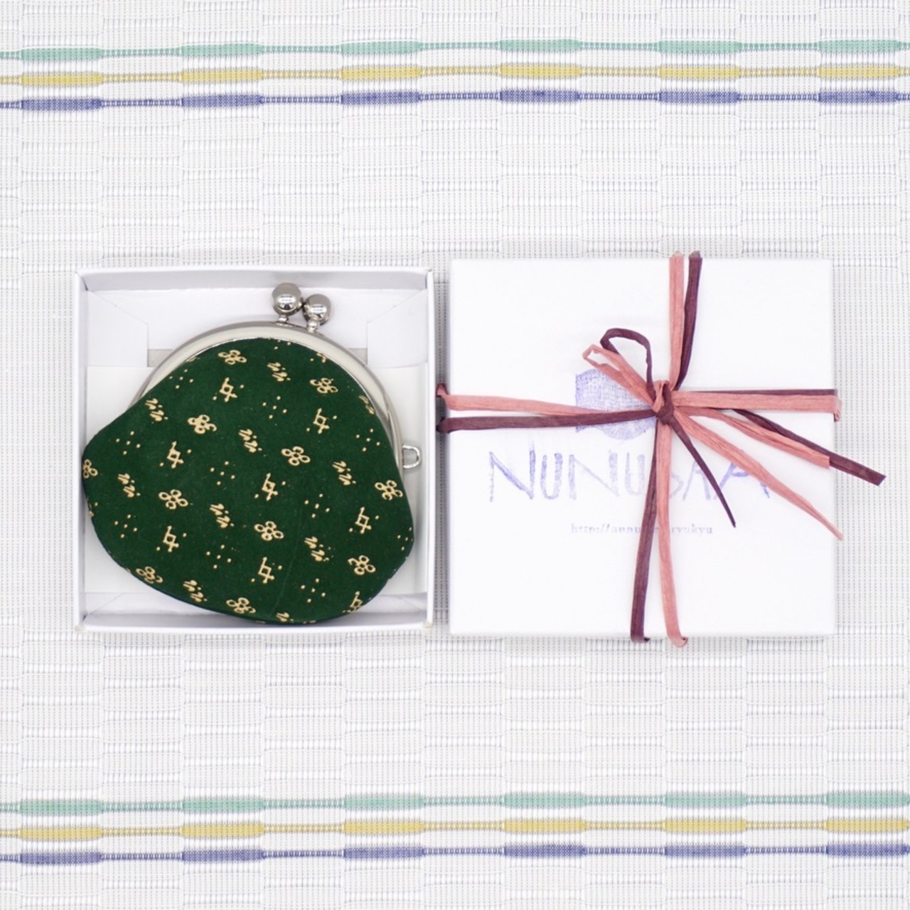 沖縄の伝統工芸品「琉球絣」と、鹿革にうるしで表現する山梨の伝統工芸品「甲州印伝」とのコラボ商品。この柄が織れるようになると一人前と認められる、琉球絣の伝統柄「ナナカシウトゥシ」がモチーフです。(漆部分)